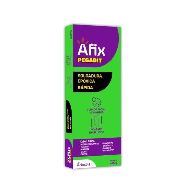 Pegadit Soldadura Epóxica rápida, adhesivo epóxico que se caracteriza por su adhesión, permitiendo unir los más diversos materiales tales como: papel, cuero, vidrio, cartón, porcelana, cerámica, acero, hierro, metales livianos, caucho vulcanizado, entre otros.